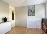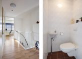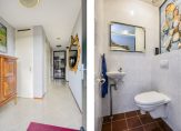 Via de voortuin met eigen parkeergelegenheid komt u bij de entree van de woning. De hal is een ruime hal met veel licht door het hoge raampartij naast de voordeur. Hier treft u de meterkast, een toiletruimte met zwevend toilet en fontein, de trap naar de verdieping en een ruime trapkast. Via de hal komt u in de ruime berging (ca. 10 m2) met grijze tegelvloer en aansluiting voor de wasapparatuur. De berging heeft zowel een kanteldeur als een loopdeur naar buiten en was oorspronkelijk als grote garage bedoelt. De huidige eigenaren hebben namelijk een deel van de garage aan de woonruimte toegevoegd. Hierdoor is er extra ruimte ontstaan in de hal, waar de eigenaren veel kastruimte hebben gecreëerd. Zo is er onder andere een grote schuifkastenwand, waar ook de warmtepomp staat opgesteld.