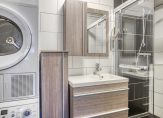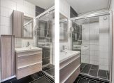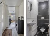 De badkamer is neutraal afgewerkt en voorzien van een ruime douchehoek en een wastafelmeubel. Tevens vindt u hier de aansluitingen voor de wasmachine en droger en een designradiator. De separate toiletruimte naast de badkamer beschikt over een vrijhangend toilet en een fonteintje.