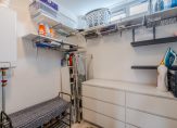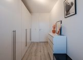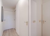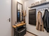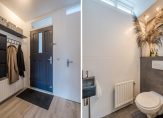 Entree in brede hal met toegang tot de vergrote toiletruimte met wandcloset en fontein, meterkast, bergkast en deur naar woonkamer.