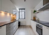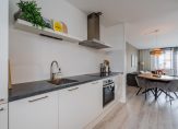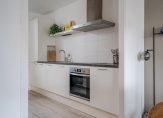 Aan de voorzijde is de moderne keuken gesitueerd, aan 2 zijden opgesteld en voorzien van een inductie kookplaat, afzuigkap, vaatwasser, koel- vriescombinatie, oven en magnetron.