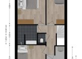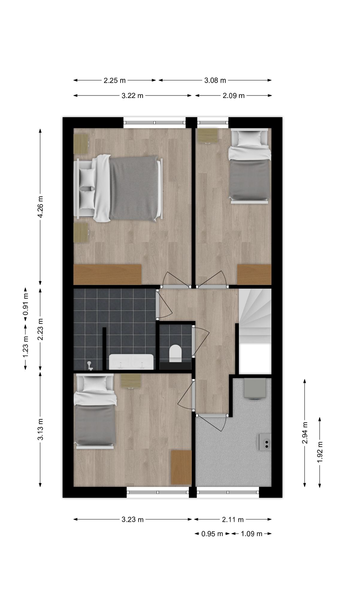 Aan de achterzijde zijn 2 slaapkamers waaronder de ruime hoofdslaapkamer en aan de voorzijde is de 3e slaapkamer.