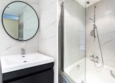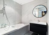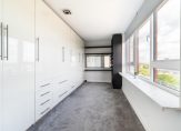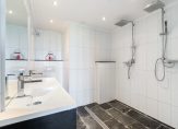 Een vaste trap leidt naar de bovenste verdieping, waar het penthouse zich van zijn meest indrukwekkende kant laat zien. De overloop biedt toegang tot twee slaapkamers. Eén daarvan geeft toegang tot een royaal dakterras – jouw eigen buitenruimte boven de stad. De tweede slaapkamer is ronduit indrukwekkend in omvang, met een kleedruimte en een luxe en-suite badkamer voorzien van dubbele douche, zwevend toilet en wastafel. Dankzij de indeling is deze ruimte eenvoudig op te splitsen in meerdere kamers, mocht je extra slaapkamers, werk- of hobbyruimte wensen.