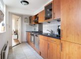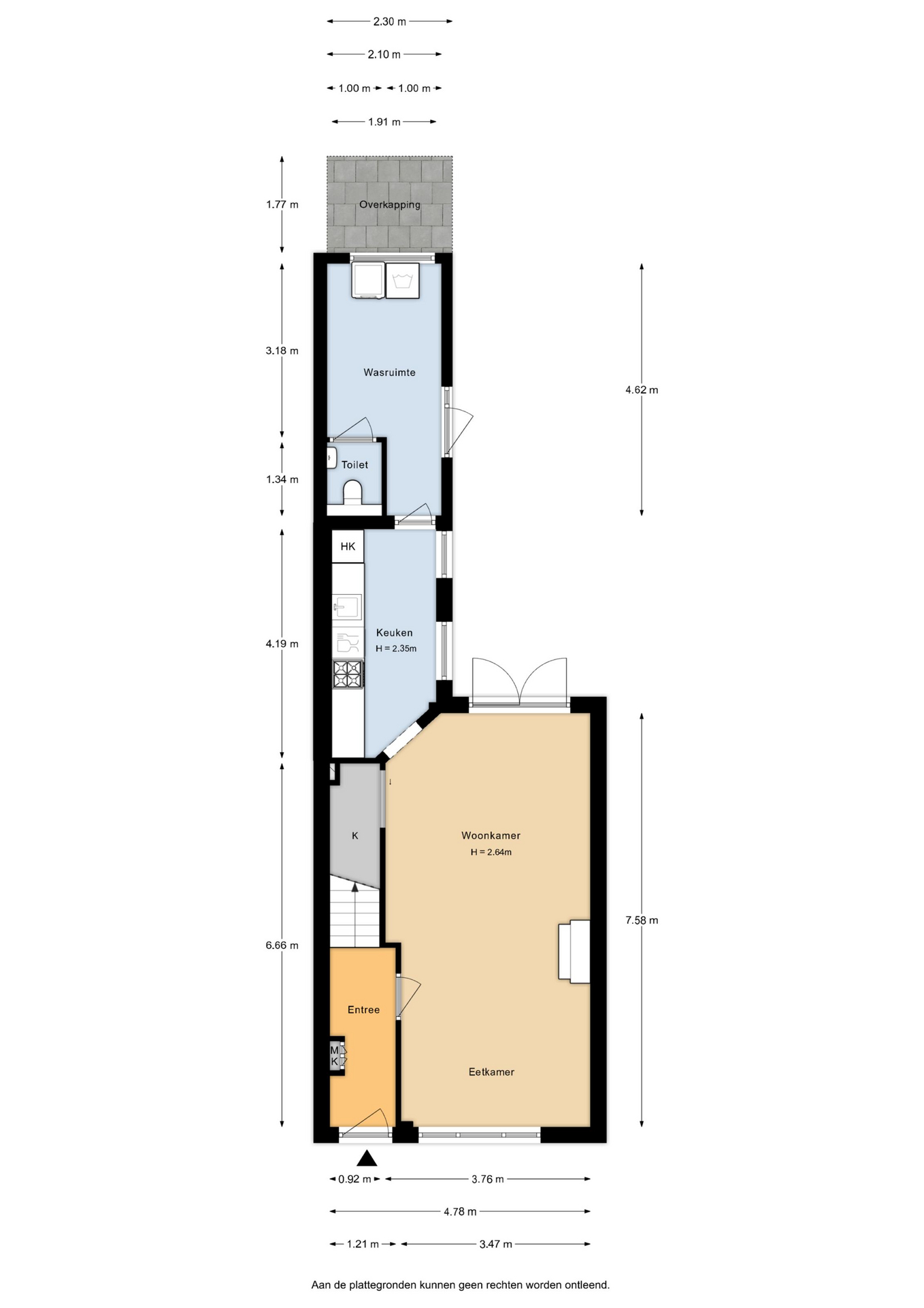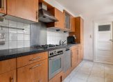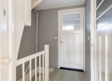 Entree met meterkast. De gezellige woonkamer heeft openslaande deuren naar de tuin en een leuk vrij uitzicht over de groenvoorziening aan de voorzijde. Aan de achterzijde ligt de uitgebouwde keuken, voorzien van een praktische bijkeuken en een verzorgd, zwevend toilet.