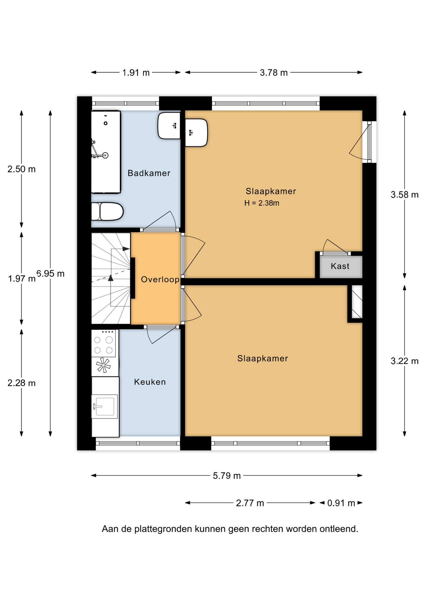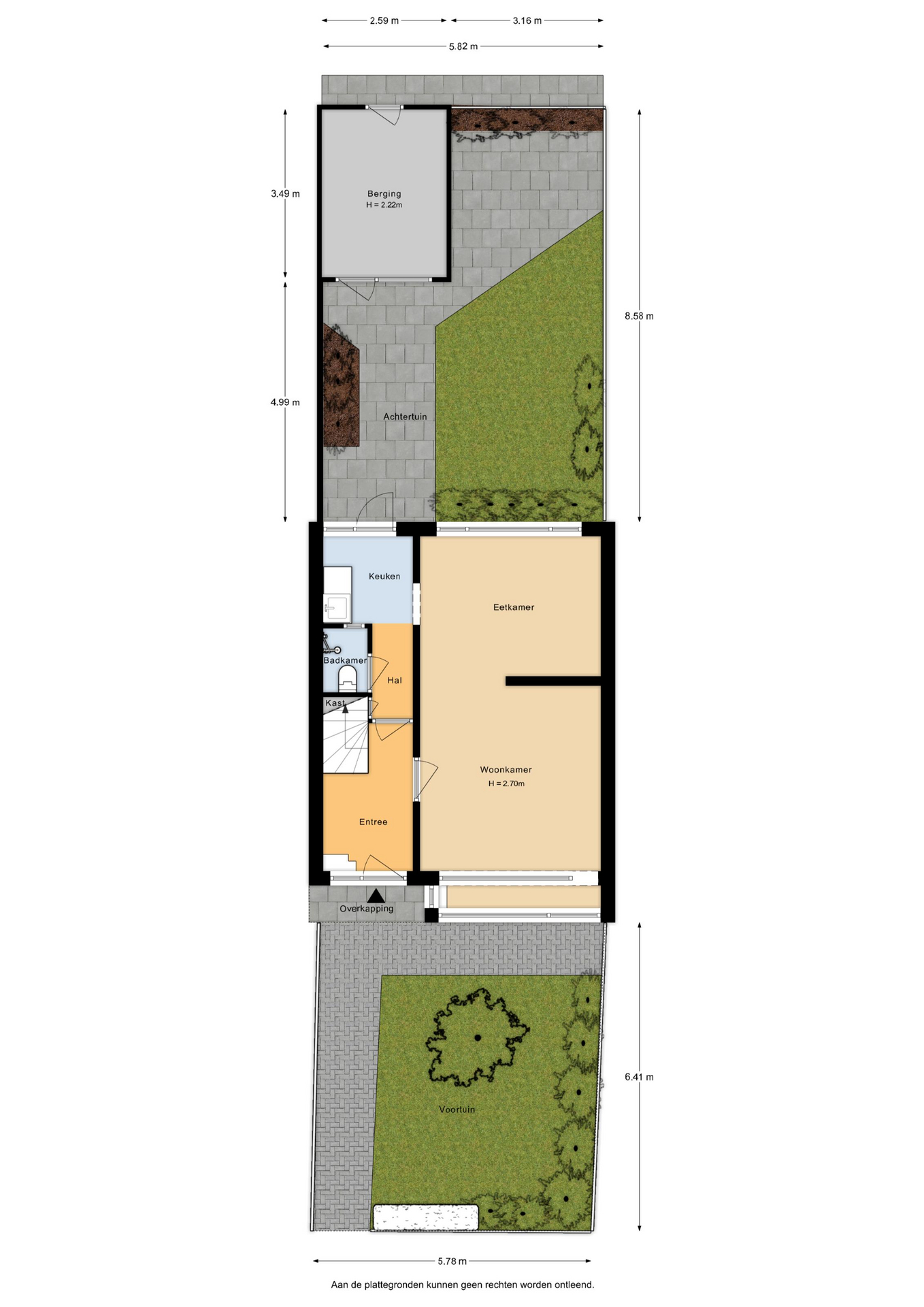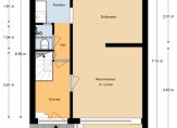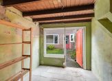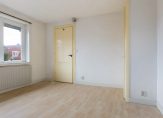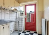 Op de begane grond bevinden zich de entree met meterkast, trapopgang en een eenvoudig toilet met douche. De woonkamer is ruim en licht, en de dichte keuken ligt aan de achterzijde van de woning. Dankzij de fijne breedte voelt het geheel ruim en comfortabel aan.