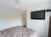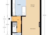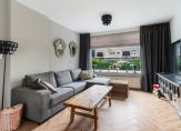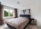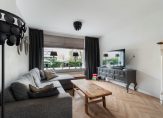 De woonkamer ligt aan de voorzijde en voelt door de hoekligging en grote ramen lekker licht en ruim aan. De afwerking is strak, met een PVC-vloer en gestucte wanden.