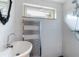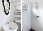 De badkamer is neutraal uitgevoerd en voorzien van een inloopdouche, wastafel en designradiator.