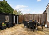 De achtertuin ligt op het zuidwesten en biedt volop zon, met een terras en een praktische berging.