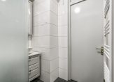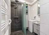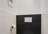 Via de hal bereik je het separate toilet en de badkamer. De badkamer is volledig betegeld in een lichte kleurstelling en uitgerust met een douche, wastafelmeubel en wasmachineaansluiting functioneel en verzorgd.