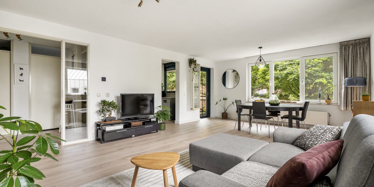 “Our home is an oasis of peace, surrounded by greenery. All the windows frame views of lush trees and nature. For many years we have also enjoyed the fact that this apartment is located on a dead-end street, which adds to the peace and quiet. The excellent insulation makes our home very comfortable. And whenever we felt like being in the heart of the city’s buzz, public transport was just a 3-minute walk away, keeping us well connected to all of Amsterdam.”