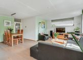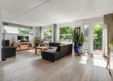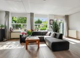 De ruime woonkamer heeft een speelse indeling met ramen aan meerdere zijden, waardoor er volop natuurlijk licht naar binnen valt en je een mooi uitzicht hebt op de groene tuin.