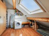 De slaapkamer heeft ook een dakkapel, wat zorgt voor een fijne, lichte kamer. Achter de knieschotten is er bovendien extra opbergruimte. Daarnaast is er een praktische bergruimte met de cv-ketel en de aansluitingen voor de wasmachine en droger.