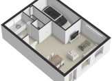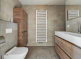 Je vindt hier twee prettige slaapkamers, ruim genoeg voor een bed, kast en/of bureau, én een moderne badkamer. De badkamer heeft een inloopdouche, een wastafel met meubel en een toilet. De mooie beige natuurstenen geven de ruimte een luxe uitstraling, terwijl de meubels met houtlook zorgen voor een warme en sfeervolle finishing touch.