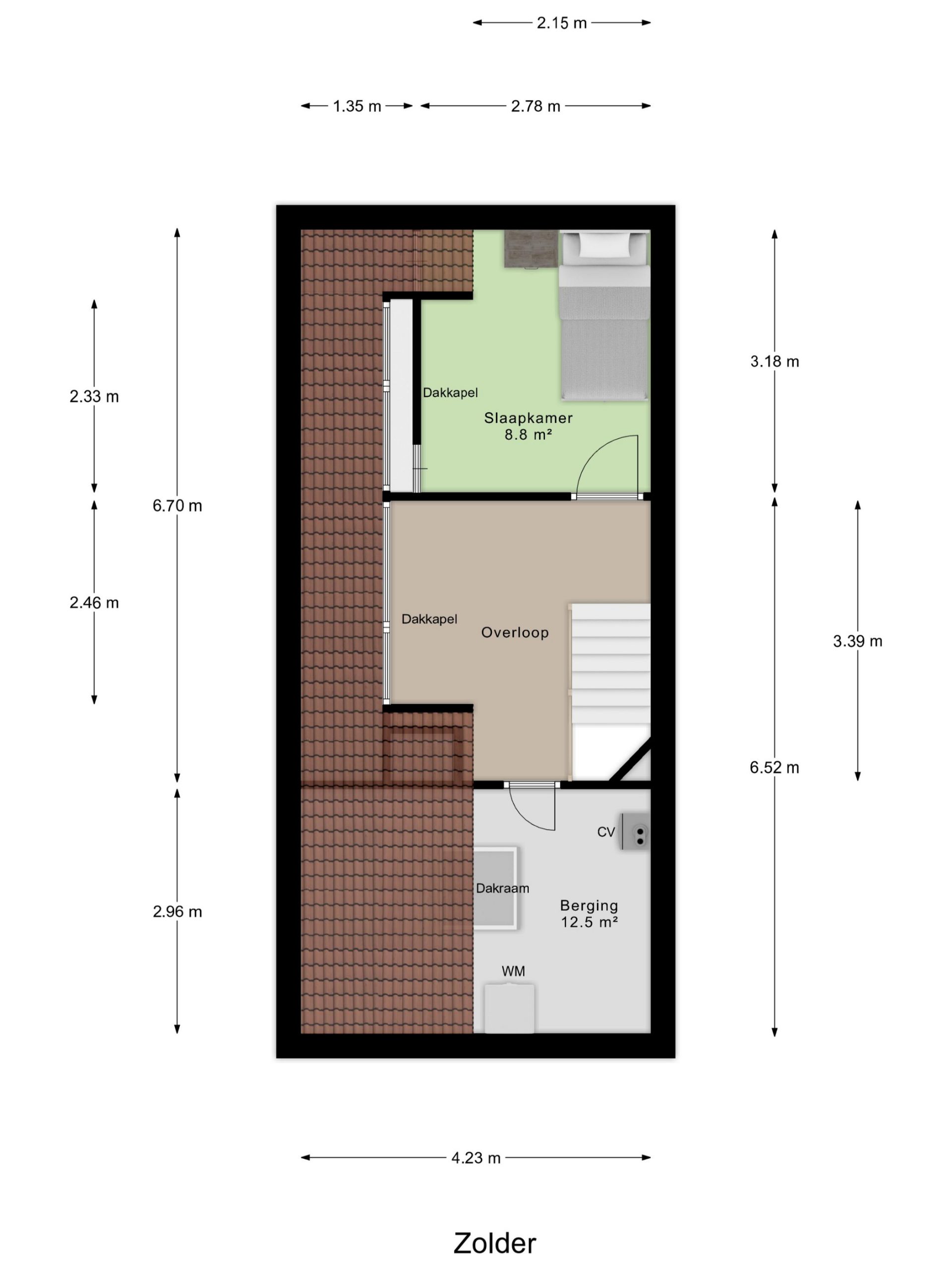 Op de bovenste verdieping vind je een overloop met toegang tot een slaapkamer en bergruimte. Dankzij de dakkapel is de overloop extra ruim en licht. Je kunt deze ruimte makkelijk gebruiken als werkplek, maar is ook voor andere doeleinden geschikt.
