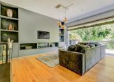 Wanneer je binnenkomt, stap je eerst de keuken binnen. De keuken is uitgerust met een kookplaat, afzuigkap, combi-oven/magnetron, koelkast (2022) en vaatwasser (2022). Het eetgedeelte is mooi afgewerkt met witte, glanzende wandtegels en heeft een groot raam waar je kunt wegdromen in het groen. De woonkamer beschikt over een houten vloer en grote ramen die tot aan de vloer reiken. Een sfeervolle open haard zorgt voor extra gezelligheid, terwijl de inbouwkast voor de televisie de ruimte een mooie, strakke afwerking geeft.