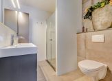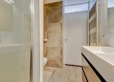 De badkamer, vernieuwd in 2018, is stijlvol afgewerkt met grijze wand- en vloertegels en beschikt over een ruime inloopdouche, een wastafelmeubel en een toilet.