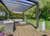 De achtertuin van ongeveer 54 m² is speels ingericht met hoogteverschillen, wat zorgt voor een unieke indeling en een gezellige sfeer. Bovenin ligt een fijn terras, en via een trapje loop je naar het vlonderterras direct aan het water. Dit is een heerlijke plek om onder de pergola te zitten en te genieten van het kabbelende water. Dankzij de ligging op het zuidoosten kun je hier de hele dag van de zon genieten.
