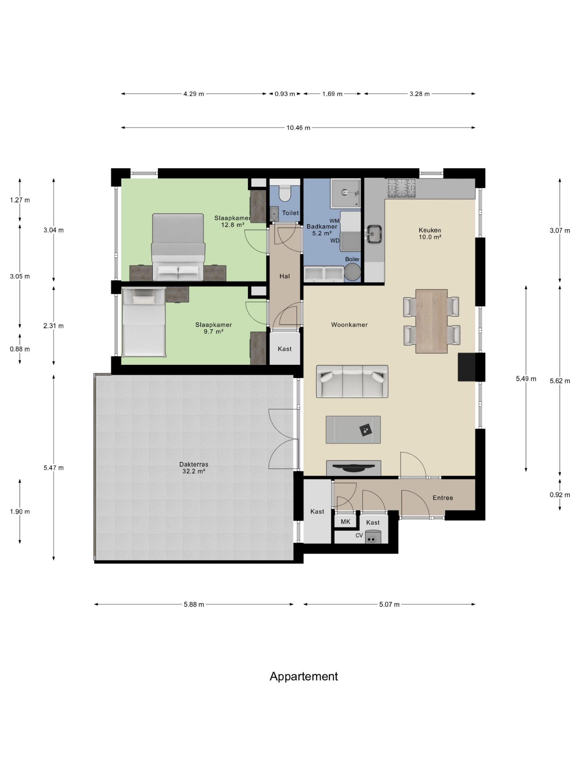 Het appartement ligt op de 2e verdieping (bovenste) van het complex en is bereikbaar via de trap. Eenmaal boven woon je volledig gelijkvloers: strak, comfortabel en overzichtelijk. Als absolute eyecatcher is er een zonnig dakterras van maar liefst 32 m². Groot genoeg voor loungeset, BBQ, planten én spontane borrels met vrienden.