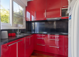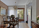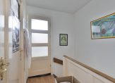 De woonkamer is karakteristiek, met een erker aan de voorzijde en openslaande deuren naar de achtertuin. De ruimte is overzichtelijk en praktisch ingedeeld. Aan de achterzijde ligt de keuken, met zicht op de tuin. Deze is functioneel ingericht, met voldoende kastruimte en aansluitend plek voor een kleine eettafel.