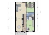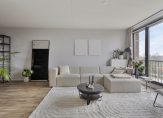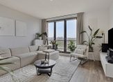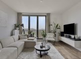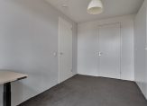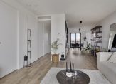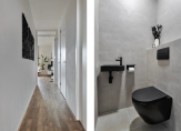 Bij binnenkomst kom je in de hal, die toegang geeft tot het toilet, een slaapkamer, de badkamer en de woonkamer. De moderne houtlook laminaatvloer loopt door naar de woonkamer, wat een mooie, strakke uitstraling geeft.
