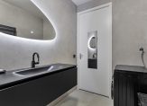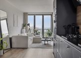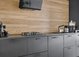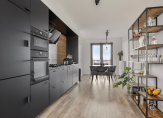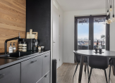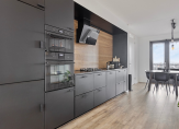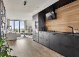 De open keuken van ongeveer 12 m² heeft een moderne uitstraling met mat zwarte kasten en een zwart aanrechtblad, afgewerkt met een houten achterwand. Uiteraard ontbreekt het je hier aan niets: (gas)kookplaat, afzuigkap, magnetron, oven, koelkast, vriezer en vaatwasser zijn allemaal aanwezig.