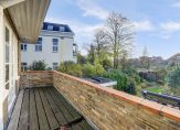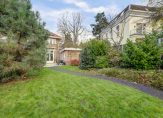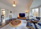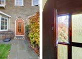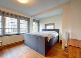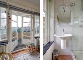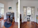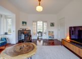 De voorkamer en eetkamer worden gescheiden door de originele schuifdeuren en zijn voorzien van een chique visgraat parketvloer en twee marmeren schouwen, allebei voorzien van een sfeervolle houtkachel. De erkers en glas-in-loodramen zorgen voor een behaaglijk en licht geheel, waar je het hele jaar door geniet van vrij uitzicht op het groen.