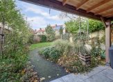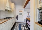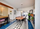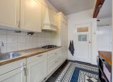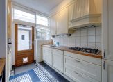 Aan de achterzijde vind je de open keuken in landhuisstijl en het eetgedeelte, voorzien van een fraaie Portugese tegelvloer. Via dubbele openslaande deuren bereik je de zeer diepe achtertuin.