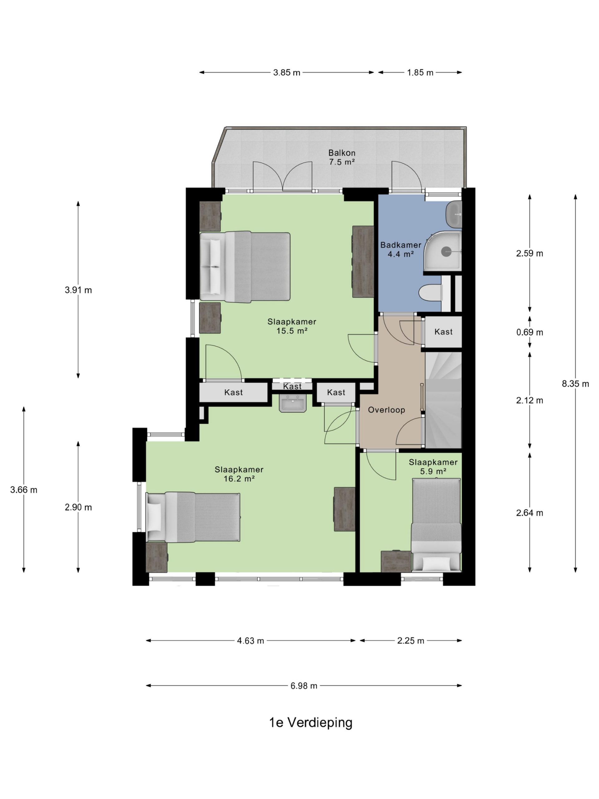 Op de verdiepingen vind je drie ruime slaapkamers, waarvan de grootste slaapkamer aan de achterzijde toegang heeft tot een  balkon met gemetselde borstwering. De zolderverdieping met dakkapel is nu in gebruik als logeer-/studeerruimte, maar heeft de potentie om een slaapkamer te realiseren.