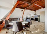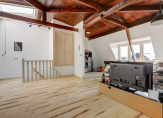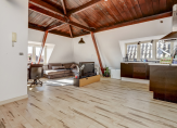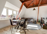 Boven aangekomen valt het prachtige daglicht van de dakkoepel direct op en geeft meteen sfeer aan de woonkamer. Dankzij het hoge plafond en houten balken voelt de ruimte ruim en open, en met ramen aan drie kanten is het appartement heerlijk licht. Voor extra opbergruimte is er een royale vaste kast.
