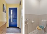 Bij binnenkomst betreedt je de hal, die toegang biedt tot het toilet, berging, de meterkast en de woonkamer. Het toilet heeft een wastafel en is afgewerkt met beige wandtegels gecombineerd met witte vloertegels. De berging is circa 8 m² en is ook van buitenaf toegankelijk.