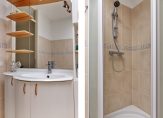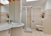 De badkamer, met een oppervlakte van ongeveer 6 m², is uitgerust met een douche, toilet, wastafel en een wastafelmeubel met spiegel. De ruimte is afgewerkt met beige wand- en vloertegels. In het plafond vindt je een daklicht wat zorgt voor een speelse doorkijk naar boven en natuurlijk licht en ventilatie in de badkamer.