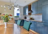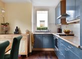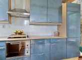 De doorgang tussen de woonkamer en de keuken is open, waardoor het eetgedeelte een uitbreiding van de woonkamer vormt, maar door de indeling toch mooi gescheiden blijft. De keuken, met een oppervlakte van ongeveer 13 m², is ingericht met groene kasten en witte wandtegels met een houten aanrechtblad. De keuken is volledig uitgerust met een gaskookplaat, afzuigkap, combi-oven/ combimagnetron, koelkast en vriezer. Er is ruimte voor een eettafel en het grote raam naar de tuin zorgt voor veel licht en uitzicht op de tuin. De tuin is te bereiken via de deur in de keuken.