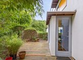De tuin ligt op de zonzijde, zodat je volop van de zon kunt genieten. De tuin beschikt over een houten terras, is omheind met een heg en uitgerust met buitenverlichting en een tuinkast.