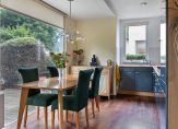 De woonkamer, met een oppervlakte van ongeveer 27 m², heeft dankzij de drie grote ramen aan verschillende zijden veel natuurlijk licht. Ook kijk je op de heerlijke groene tuin. De woonkamer heeft een parketvloer die doorloopt in de keuken.