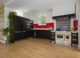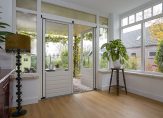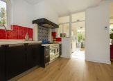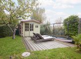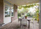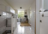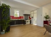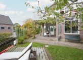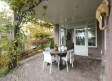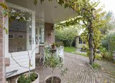 Bij binnenkomst ervaar je meteen de sfeer: een woonkamer en grote open keuken voorzien van diverse inbouwapparatuur, met aangrenzende eetkamer die dankzij openslaande deuren direct contact met de tuin geeft. De woning heeft een uitbouw die thans dienst doet als bijkeuken, compleet met wasmachine- en drogeraansluiting, ruimte voor een kantoor aan huis en een kelder. De uitbouw is voorzien van grote raampartijen die zorgen voor natuurlijk daglicht en een deur die direct naar de tuin leidt. Op het dak van de uitbouw ligt een sfeervol dakterras vanwaar je een prachtig uitzicht hebt over de omgeving.