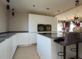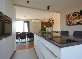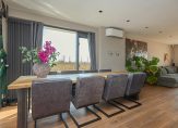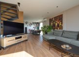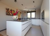 Deze hal mondt uit in de woonkamer met luxe semi-open en haast nagelnieuwe woonkeuken met hoogwaardige inbouwapparatuur, veel kastruimte en kookeiland met zitgedeelte. De woonkamer is L-vormig en heeft daardoor een mooie natuurlijke tweedeling ter plaatse van het eetgedeelte en het zitgedeelte. De woonkamer is zowel voorzien van airconditioning als een charmante haard.
