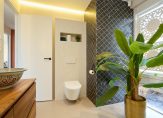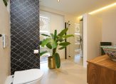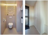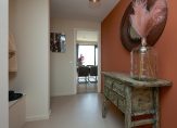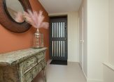 Hoewel de garage voor de daartoe geldende begrippen absoluut de schoonheidsprijs verdient, wordt u na het passeren van deze ruimte in luxe ondergedompeld. Zo belandt u in de hand gestucte beton ciré beklede tussenhal, met de hoofdentree, luxe badkamer (v.v. vloerverwarming, eigentijdse afwerking van hoog niveau, toilet en inloopdouche) en de doorgang naar de hoofdslaapkamer. Voor de oplettende lezer; ja, u kunt hier dus prima gelijkvloers wonen.