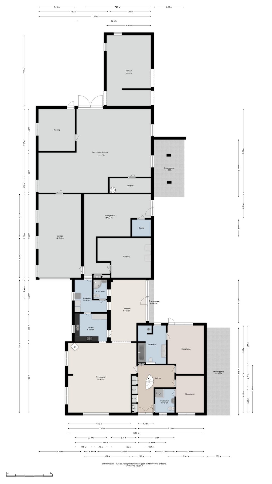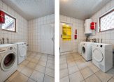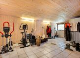 Het achterste gedeelte van de woning biedt een indrukwekkend scala aan functionele ruimtes. Zo is er een grote garage met interne doorgang, diverse bergingen, een technische ruimte en een aparte fitness-/hobbyruimte met aangrenzend een sauna.