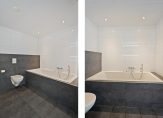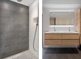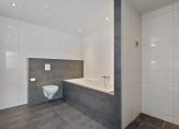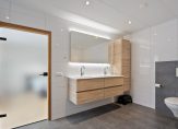 Op de begane grond zijn meerdere slaapkamers gesitueerd, waaronder een ruime masterbedroom. Deze slaapkamer beschikt over directe toegang tot een luxe badkamer, voorzien van ligbad, inloopdouche, dubbele wastafel en toilet. Daarnaast is er een tweede badkamer, ideaal voor gasten of gezinsleden, uitgerust met douche, wastafel en toilet. Hiermee is de woning volledig levensloopbestendig.