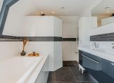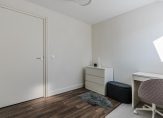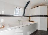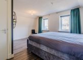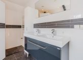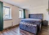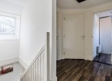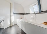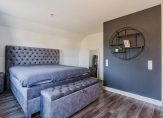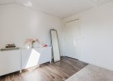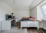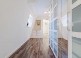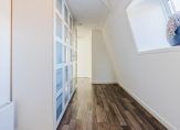 De overloop geeft toegang tot drie slaapkamers, een vaste kastenwand en een separate toiletruimte. De royale hoofdslaapkamer strekt zich uit over de volledige breedte van de woning. De moderne badkamer is uitgerust met een ligbad, dubbele wastafel en een inloopdouche. Een vlizotrap leidt naar de praktische vliering.