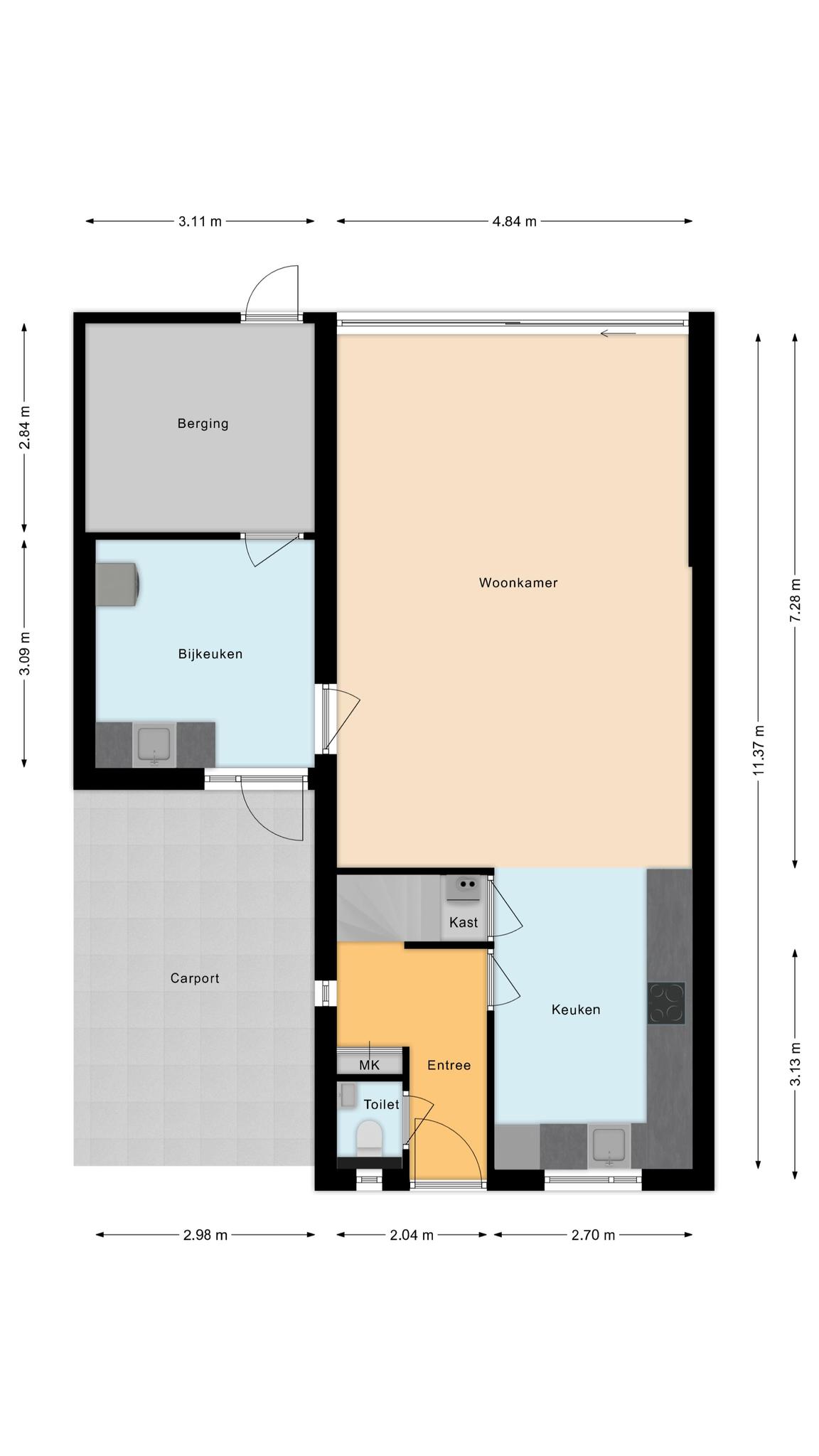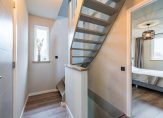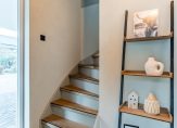 Je komt binnen in de hal met een toilet. De moderne keuken is voorzien van alle inbouwapparatuur. Een ruim uitgebouwde woonkamer met een schuifpui naar het zonneterras. Verder is de begane grond voorzien van een bijkeuken en berging.