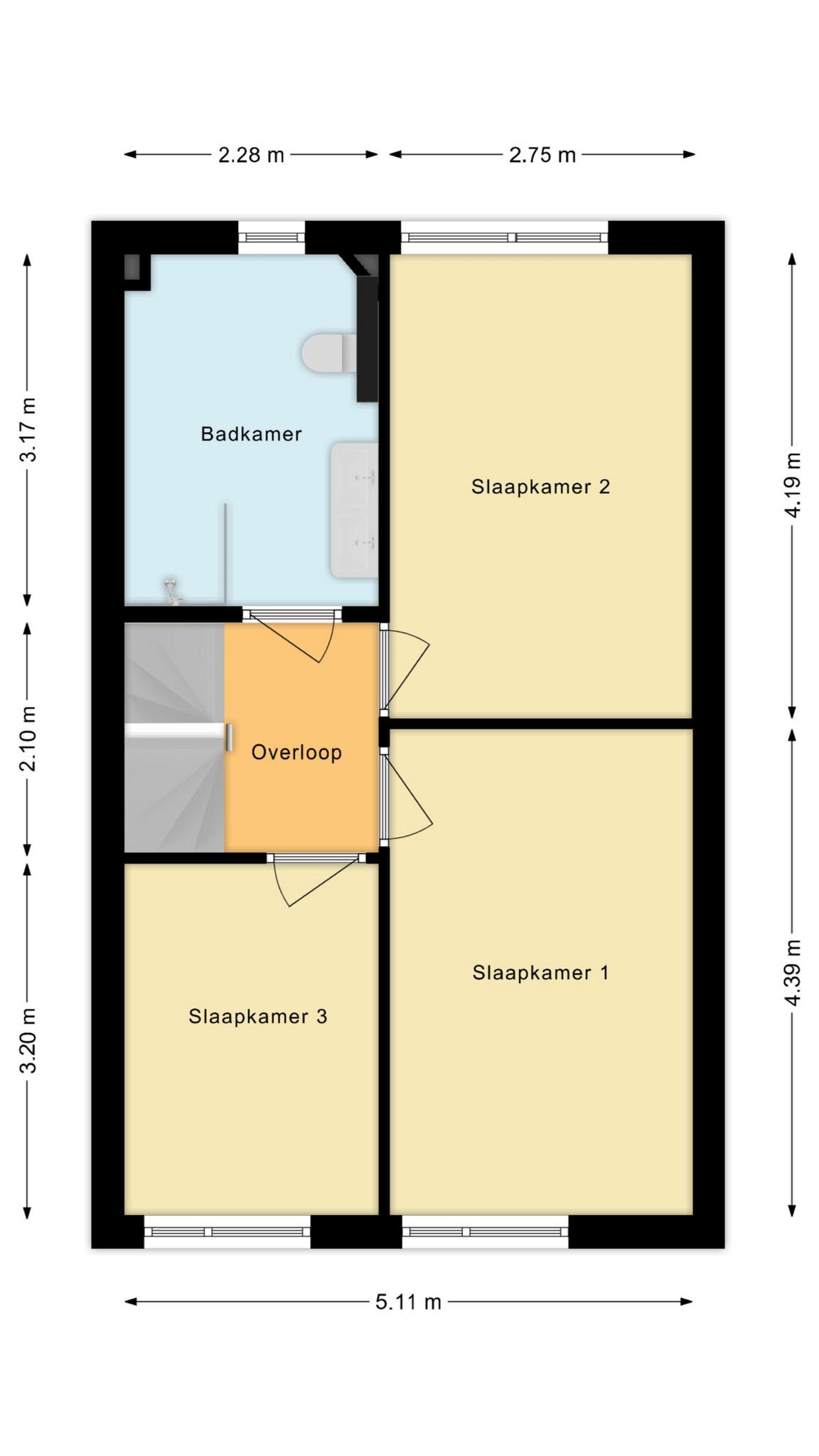 Op de eerste verdieping bevinden zich drie slaapkamers en de in 2023 vernieuwde badkamer. Deze moderne badkamer is stijlvol afgewerkt en beschikt over een designradiator, een inloopdouche, een wastafel en een tweede toilet.