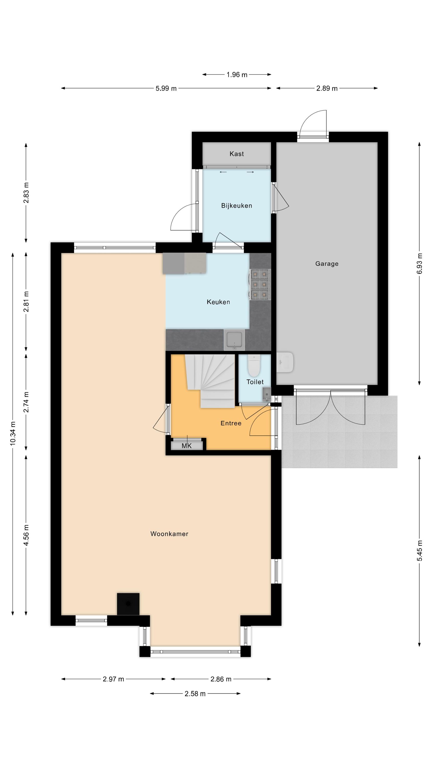 Aansluitend bevindt zich de bijkeuken met wasopstelling en doorgang naar de aangebouwde garage en de tuin.