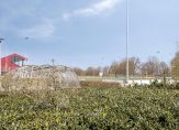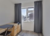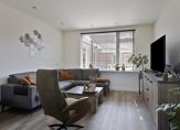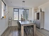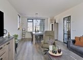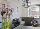 Een trendy zwarte deur met glas geeft toegang tot de lichte woonkamer, met lichtinval aan drie zijden. Het zitgedeelte, aan de achterzijde, is gesitueerd op het zuiden en vanaf het eetgedeelte kijk je richting de sportvelden. De afwerking is fraai, met stucwerk en inbouwverlichting in het plafond.