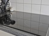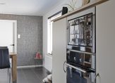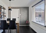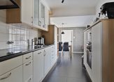 De keuken is aan de achterzijde uitgebouwd, waardoor er ruimte voor een eethoek is. Erg fijn is de lichtinval bij het eetgedeelte en het behang past goed bij de donkere tegelvloer. De royale keukenopstelling biedt veel bergruimte en de inductie kookplaat, afzuigkap, vaatwasser, oven, magnetron en koelkast zijn ingebouwd.