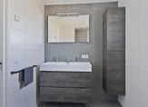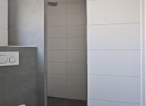 De moderne badkamer (2021) is ingedeeld met een inloopdouche, een breed wastafelmeubel met zijkast, een spiegel met verlichting en een wandcloset. Grote wand- en vloertegels, in wit en grijs, geven de badkamer een luxe uitstraling.