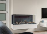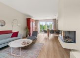 De L-vormige woonkamer is licht en ruimtelijk, met grote ramen en een gashaard die voor een prettige sfeer zorgt.