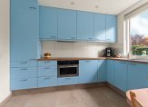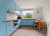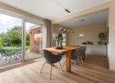 Van de woonkamer kom je in de eetkeuken aan de achterzijde van de woning. De keuken is voorzien van vloerverwarming en heeft een praktische opstelling, voorzien van Miele apparatuur, met voldoende ruimte voor een eettafel.
