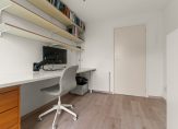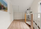 De overloop, voorzien van laminaatvloer, geeft toegang tot drie slaapkamers van goed formaat. De badkamer is modern uitgevoerd en beschikt over een inloopdouche, sunshower, enkele grote wastafel, een tweede toilet en vloerverwarming.