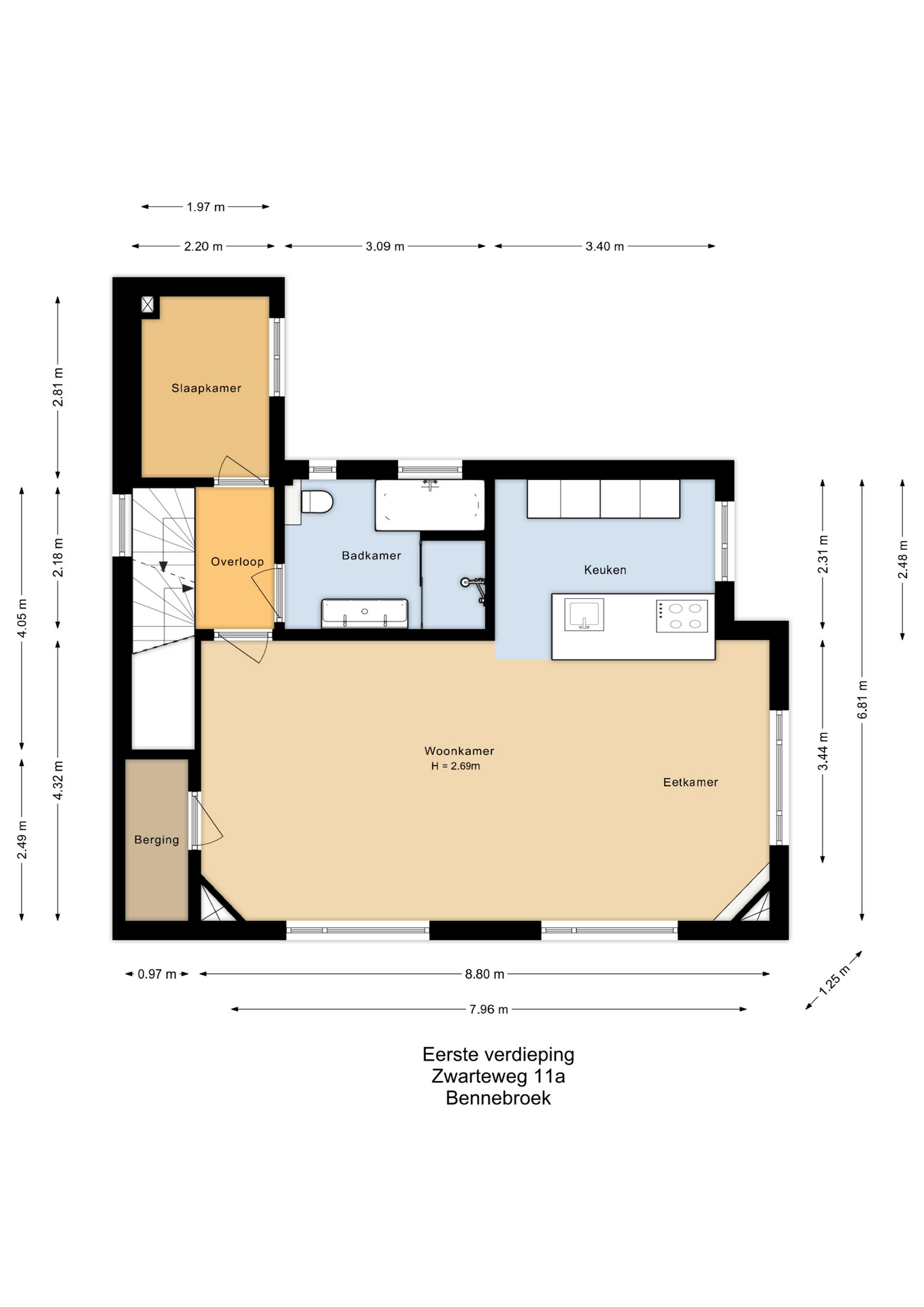 Overloop, verrassend ruime en lichte woonkamer met veel lichtinval door de hoekligging – een heerlijke leefruimte!, berging, open keuken voorzien van diverse inbouwapparatuur, moderne badkamer met toilet, inloopdouche, ligbad en wastafelmeubel, ruime slaapkamer.
