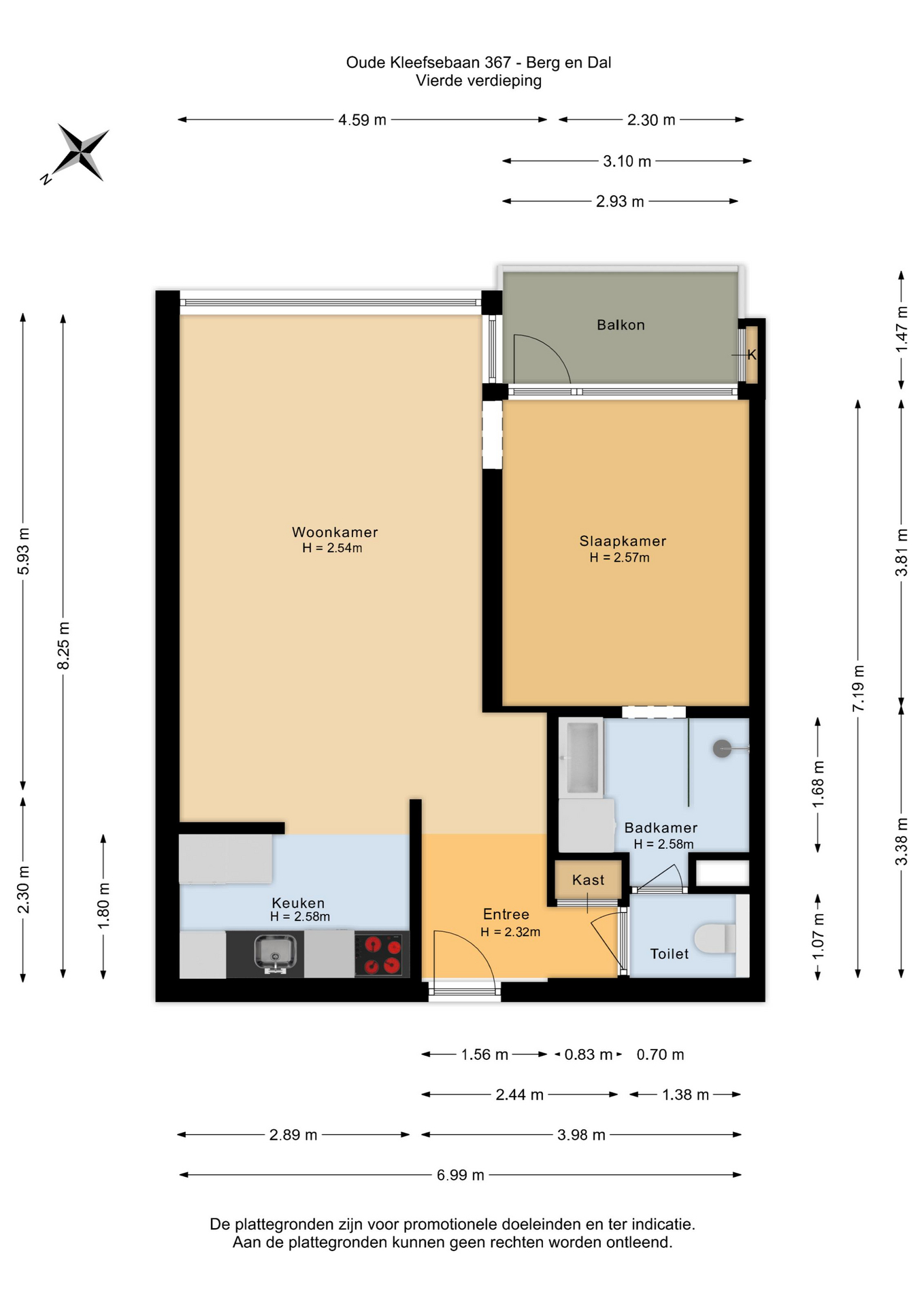 Met de lift kunt u naar de vierde verdieping waar het appartement te vinden is. Via de entree komt u in de hal met toegang tot het toilet. De lichte woonkamer is afgewerkt en biedt een mooi, vrij uitzicht.